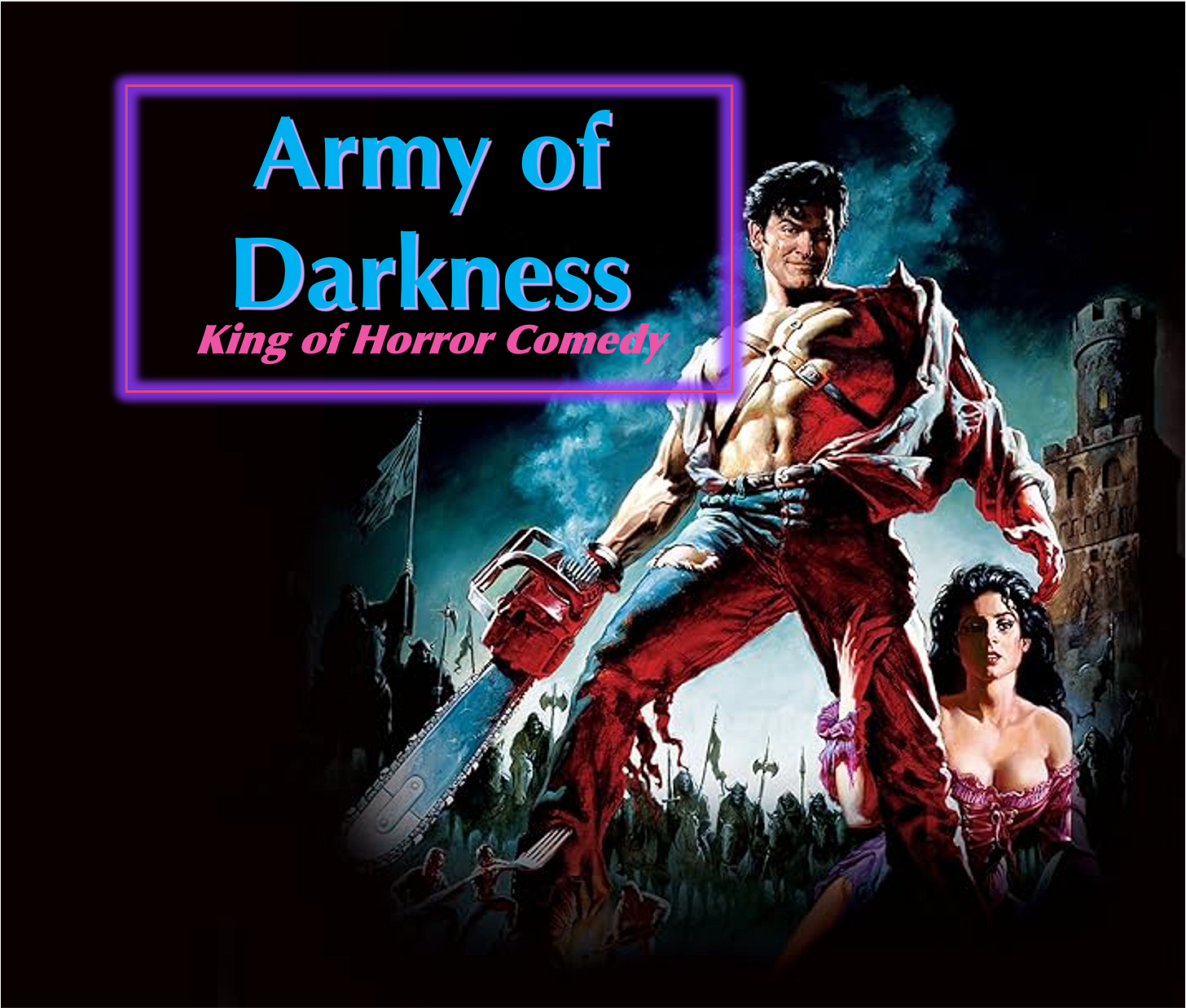 Quick synopsis: Grumpy S-Mart clerk Ash is vortex-yeeted to 1300 AD, must recite “Klaatu Barada Nikto” to grab the Necronomicon and go home; flubs the words, unleashes his evil doppelgänger and a skeleton horde; rallies knights with 20th-century boomstick bravado.